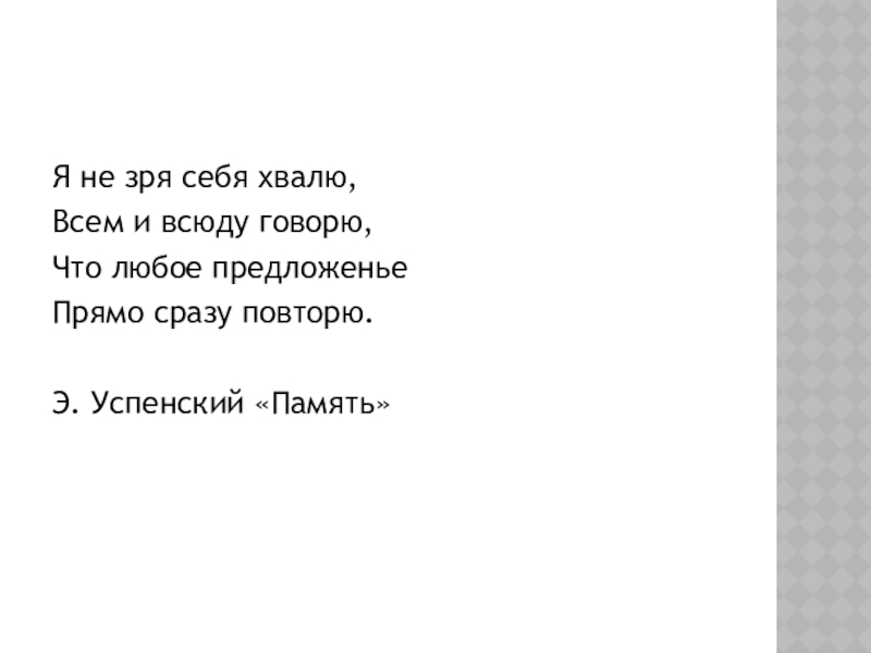 Я не зря себя хвалю,Всем и всюду говорю,Что любое предложеньеПрямо сразу повторю.Э. Успенский «Память»