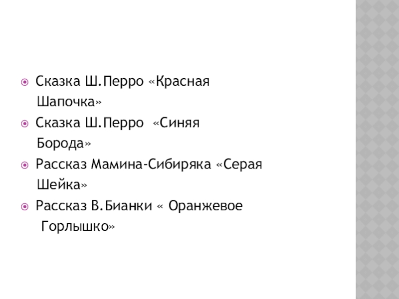 Сказка Ш.Перро «Красная  Шапочка»Сказка Ш.Перро «Синяя  Борода»Рассказ Мамина-Сибиряка «Серая  Шейка»Рассказ В.Бианки « Оранжевое
