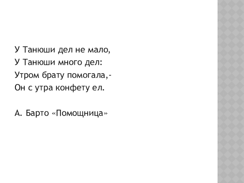 У Танюши дел не мало,У Танюши много дел:Утром брату помогала,-Он с утра конфету ел.А. Барто «Помощница»