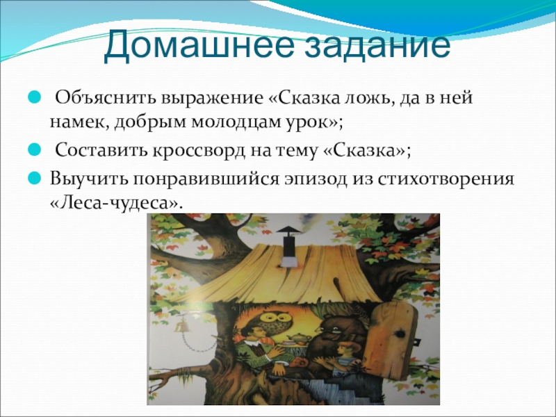 Домашнее задание   Объяснить выражение «Сказка ложь, да в ней намек, добрым молодцам урок»; Составить кроссворд