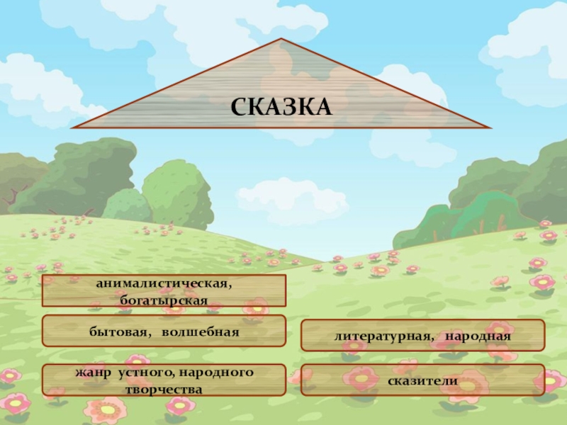 жанр устного, народного творчествабытовая,  волшебнаяанималистическая, богатырскаясказителилитературная,  народная СКАЗКА