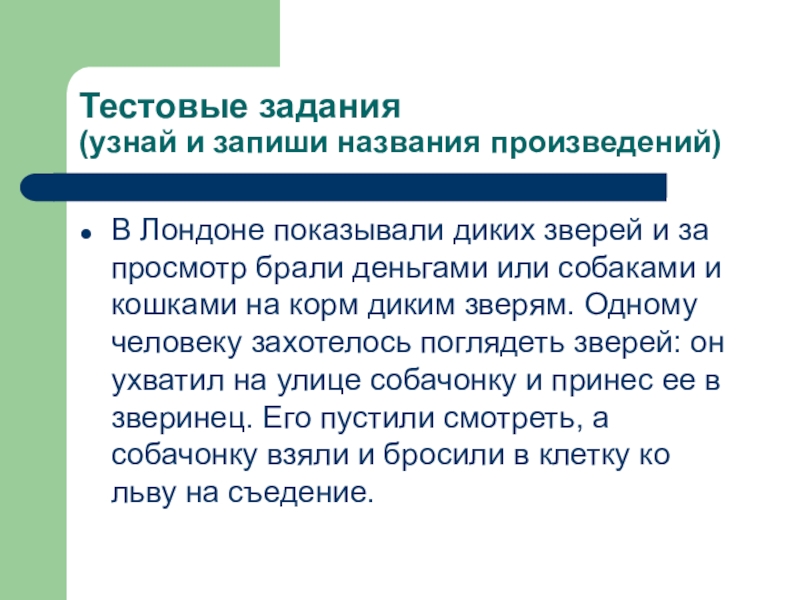 Тестовые задания (узнай и запиши названия произведений)В Лондоне показывали диких зверей и за просмотр брали деньгами или