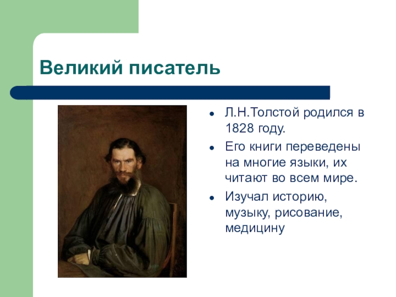 Великий писательЛ.Н.Толстой родился в 1828 году.Его книги переведены на многие языки, их читают во всем мире.Изучал историю, музыку, рисование, медицину