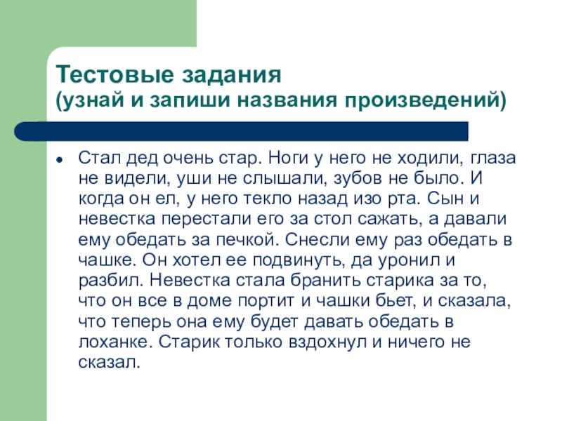 Тестовые задания (узнай и запиши названия произведений)Стал дед очень стар. Ноги у него не ходили, глаза не