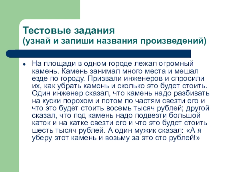 Тестовые задания (узнай и запиши названия произведений)На площади в одном городе лежал огромный камень. Камень занимал много