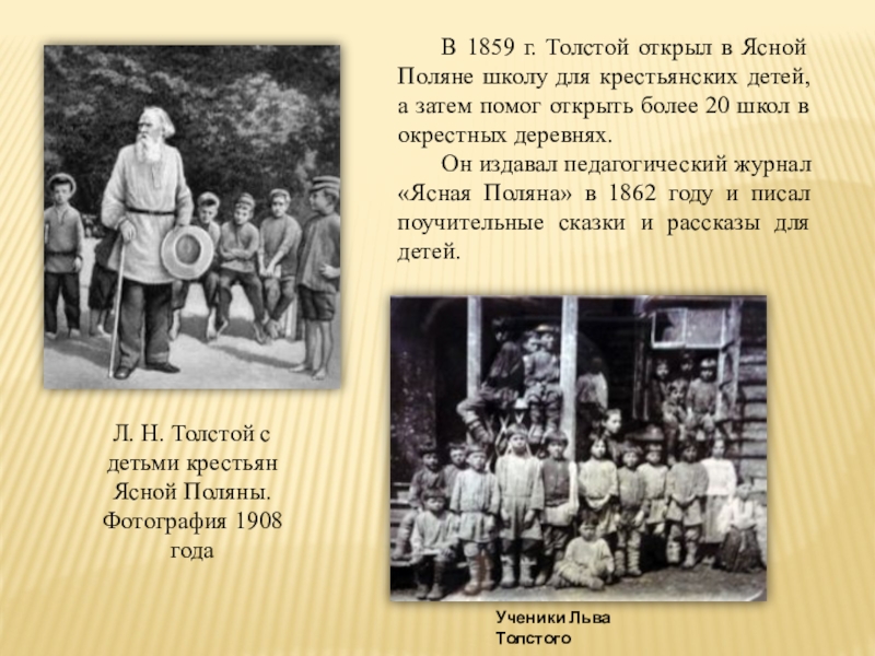Л. Н. Толстой с детьми крестьян Ясной Поляны.