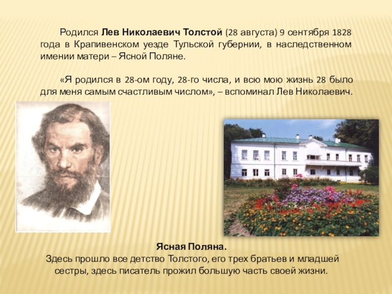 Родился Лев Николаевич Толстой (28 августа) 9 сентября 1828 года в Крапивенском уезде Тульской губернии, в наследственном имении матери – Ясной Поляне.
