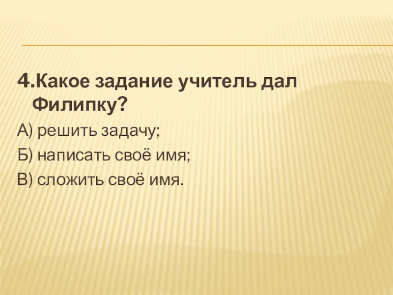 4.Какое задание учитель дал Филипку?А) решить задачу;Б) написать своё имя;В) сложить своё имя.