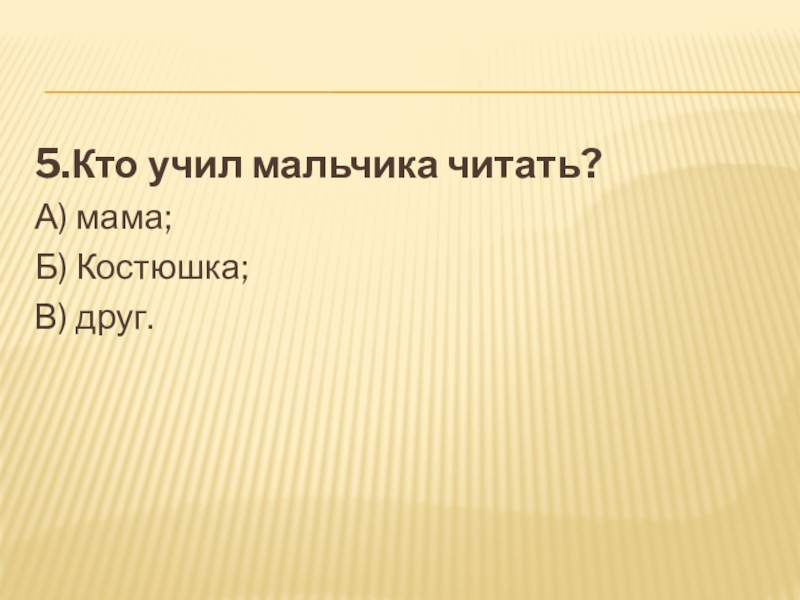 5.Кто учил мальчика читать?А) мама;Б) Костюшка;В) друг.