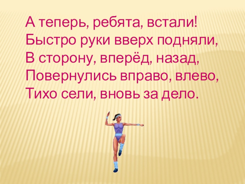 А теперь, ребята, встали!Быстро руки вверх подняли,В сторону, вперёд, назад,Повернулись вправо, влево,Тихо сели, вновь за дело.