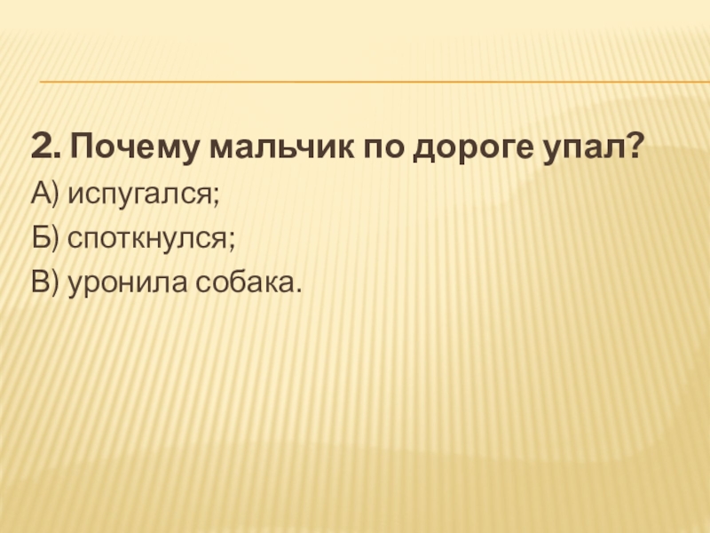 2. Почему мальчик по дороге упал?А) испугался;Б) споткнулся;В) уронила собака.