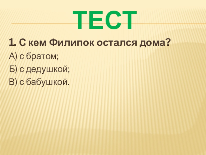 ТЕСТ1. С кем Филипок остался дома?А) с братом;Б) с дедушкой;В) с бабушкой.