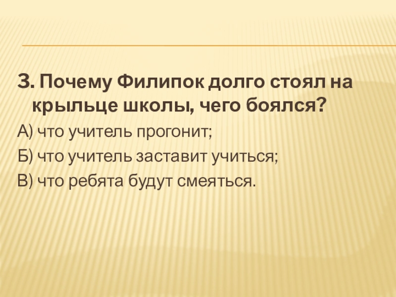 3. Почему Филипок долго стоял на крыльце школы, чего боялся?А) что учитель прогонит;Б) что учитель заставит учиться;В)