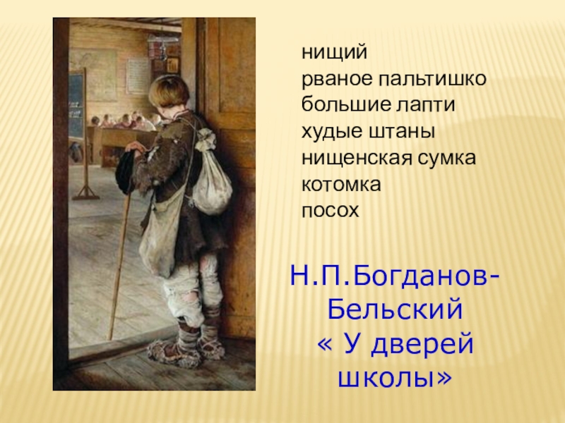 Н.П.Богданов-Бельский « У дверей школы»нищийрваное пальтишкобольшие лаптихудые штанынищенская сумкакотомкапосох