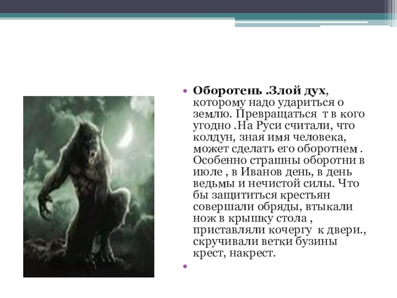 Слайд 13Оборотень .Злой дух, которому надо удариться о землю. Превращаться т в