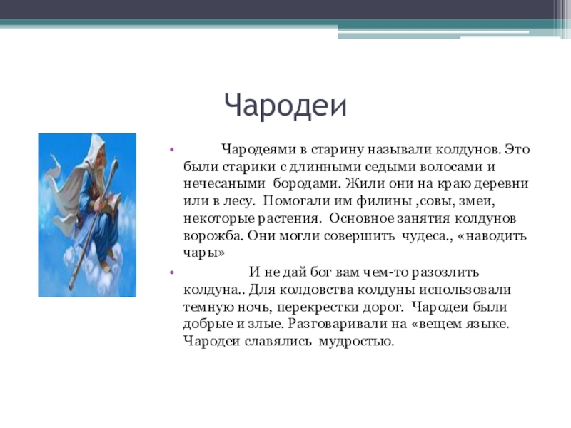 И не дай бог вам чем-то разозлить колдуна.. Для колдовства колдуны использовали темную ночь, перекрестки дорог. Чародеи были добрые и злые. Разговаривали на «вещем языке. Чародеи славялись мудростью.