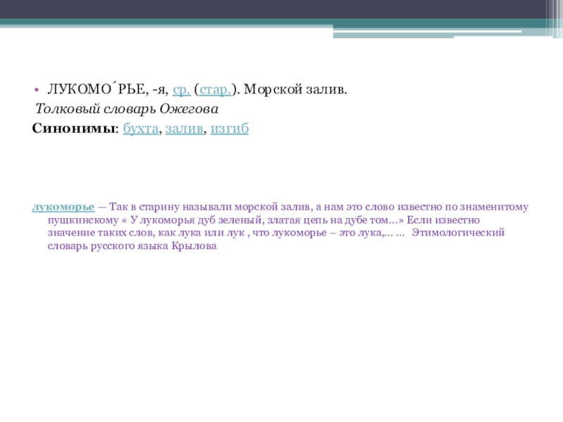 лукоморье — Так в старину называли морской залив, а нам это слово известно по знаменитому пушкинскому « У лукоморья дуб зеленый, златая цепь на дубе том...» Если известно значение таких слов, как лука или лук , что лукоморье – это лука,… … Этимологический словарь русского языка Крылова