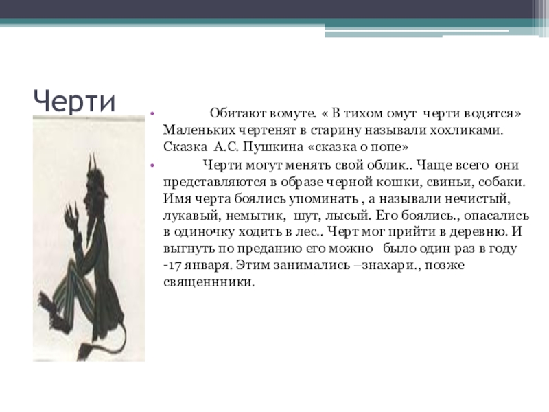 тихом омут черти водятся» Маленьких чертенят в старину называли хохликами. Сказка А.С. Пушкина «сказка о попе»