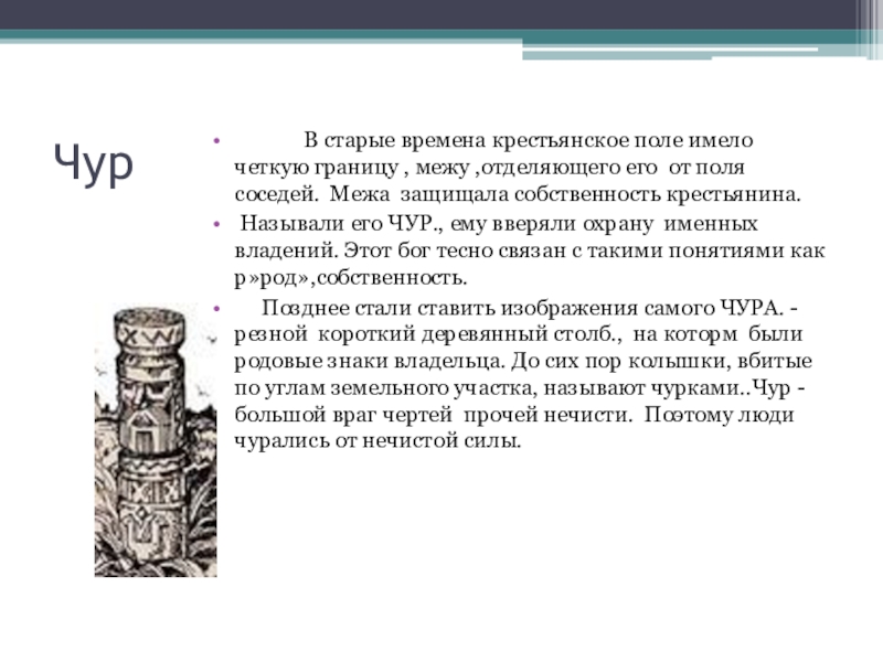 Называли его ЧУР., ему вверяли охрану именных владений. Этот бог тесно связан с такими понятиями как р»род»,собственность.