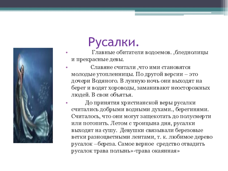 До принятия христианской веры русалки считались добрыми водными духами., берегинями. Считалось, что они могут защекотать до полусмерти или потопить. Летом с троицына дня, русалки выходят на сушу. Девушки связывали березовые ветки разноцветными лентами, т. к. любимое дерево русалок –береза. Самое верное средство отвадить русалок трава полынь»-трава окаянная»