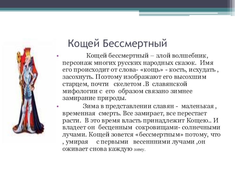 – злой волшебник, персонаж многих русских народных сказок. Имя его происходит от слова- «кощь» - кость, исхудать ,засохнуть. Поэтому изображают его высохшим старцем, почти скелетом .В славянской мифологии с его образом связано зимнее замирание природы.