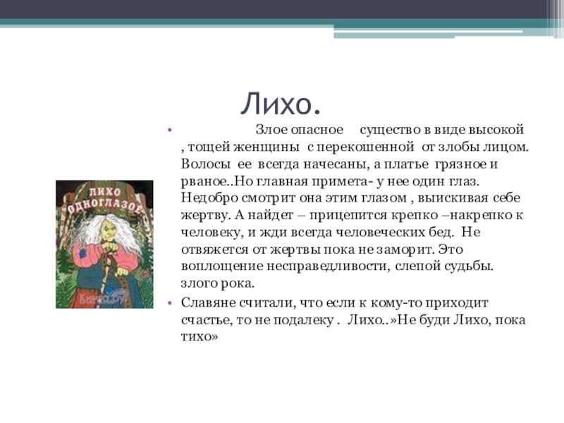 Славяне считали, что если к кому-то приходит счастье, то не подалеку . Лихо..»Не буди Лихо, пока тихо»