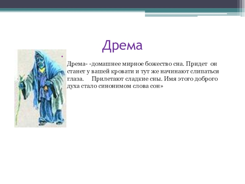 Дрема- -домашнее мирное божество сна. Придет он станет у вашей кровати и тут же начинают слипаться глаза. Прилетают сладкие сны. Имя этого доброго духа стало синонимом слова сон»