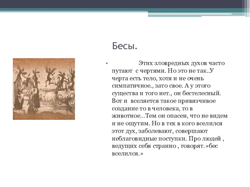 духов часто путают с чертями. Но это не так..У черта есть тело, хотя и не очень симпатичное., зато свое. А у этого существа и того нет., он бестелесный. Вот и вселяется такое привязчивое создание то в человека, то в животное…Тем он опасен, что не видем и не ощутим. Но в тех в кого вселился этот дух, заболевают, совершают неблаговидные поступки. Про людей , ведущих себя странно , говорят.»бес вселился.»