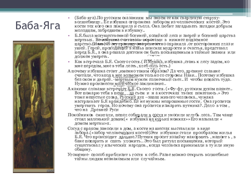 А какими словами встречает Б.Я. Своего гостя. («Фу-фу, русским духом пахнет..Вот пожарю тебя в печи да съем и н а косточках твоих покатаюсь.» Это тоже непустые слова. Русский дух –запах живого человека., чужака настраивает Б.Я враждебно. Ей не нужны непрошнные гости. Она грозится умертвить героя. Но почему она грозится изжарить путника?. Дело в том , что на Древней Руси