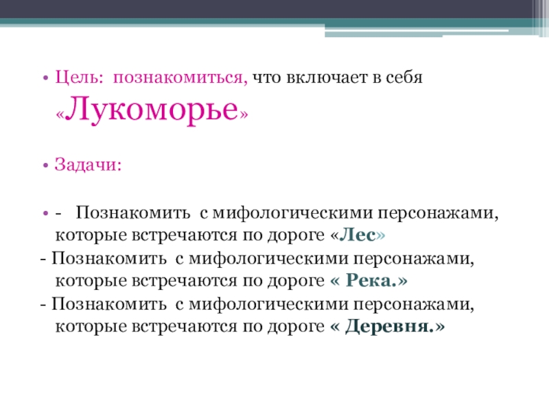 Цель: познакомиться, что включает в себя «Лукоморье»