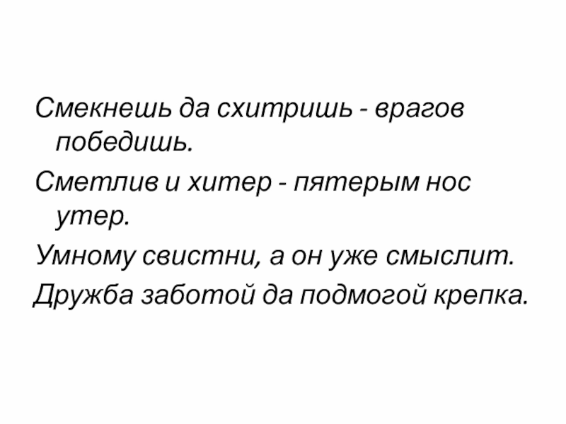 Смекнешь да схитришь - врагов победишь.Сметлив и хитер - пятерым нос утер.Умному свистни, а он уже смыслит.Дружба
