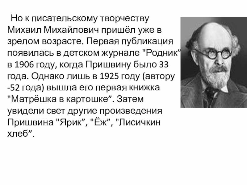возрасте. Первая публикация появилась в детском журнале "Родник” в 1906 году, когда Пришвину было 33 года. Однако лишь в 1925 году (автору -52 года) вышла его первая книжка "Матрёшка в картошке”. Затем увидели свет другие произведения Пришвина "Ярик”, "Ёж”, "Лисичкин хлеб”.