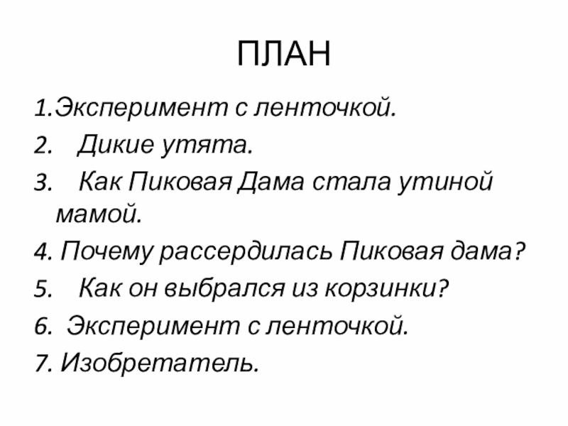 ПЛАН1.Эксперимент с ленточкой.2.  Дикие утята.3.  Как Пиковая Дама стала утиной мамой.4. Почему рассердилась Пиковая дама?