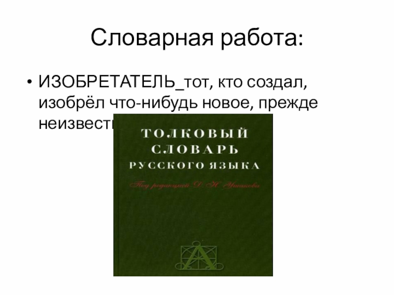 Словарная работа:ИЗОБРЕТАТЕЛЬ_тот, кто создал, изобрёл что-нибудь новое, прежде неизвестное