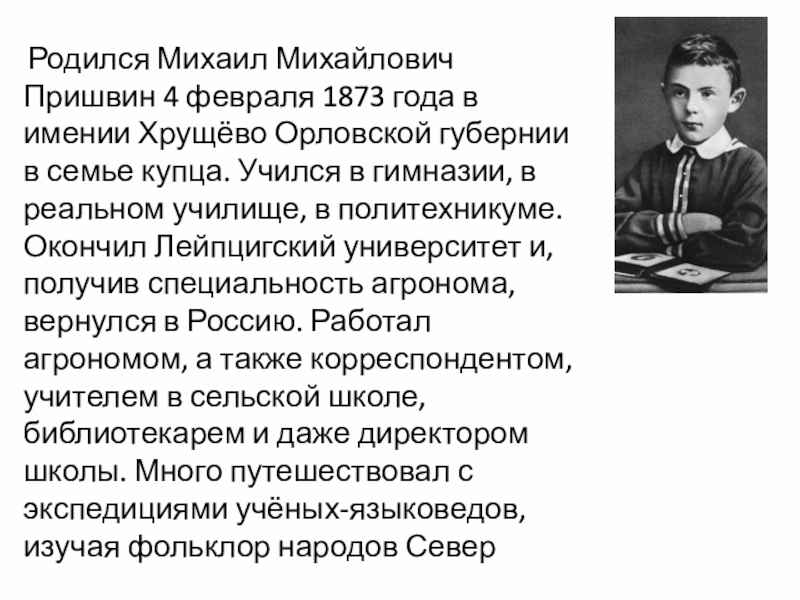 Родился Михаил Михайлович Пришвин 4 февраля 1873 года в имении Хрущёво Орловской губернии в семье купца. Учился в гимназии, в реальном училище, в политехникуме. Окончил Лейпцигский университет и, получив специальность агронома, вернулся в Россию. Работал