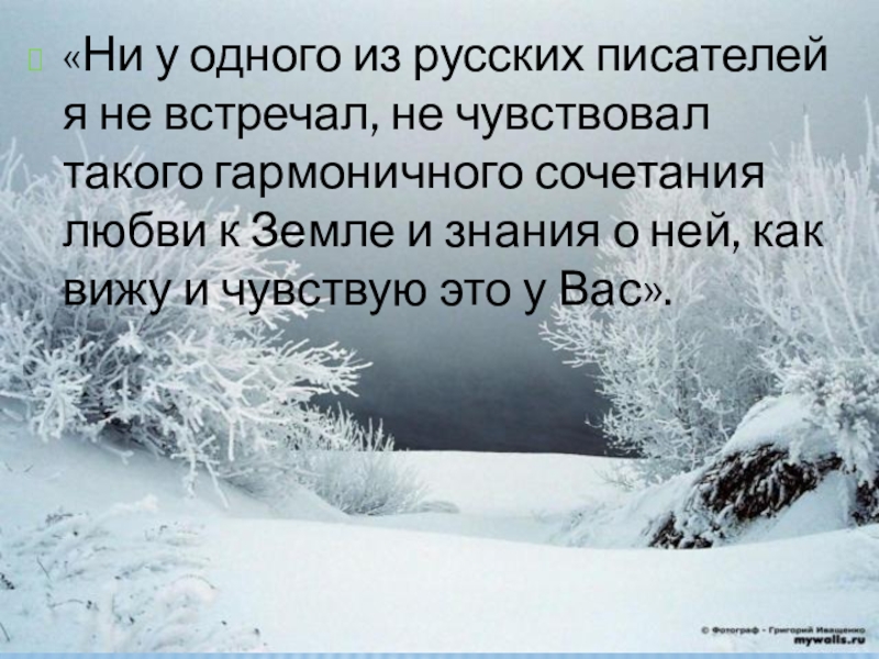 «Ни у одного из русских писателей я не встречал, не чувствовал такого гармоничного сочетания любви к Земле