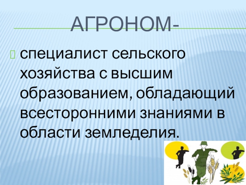 агроном-специалист сельского хозяйства с высшим образованием, обладающий всесторонними знаниями в области земледелия.