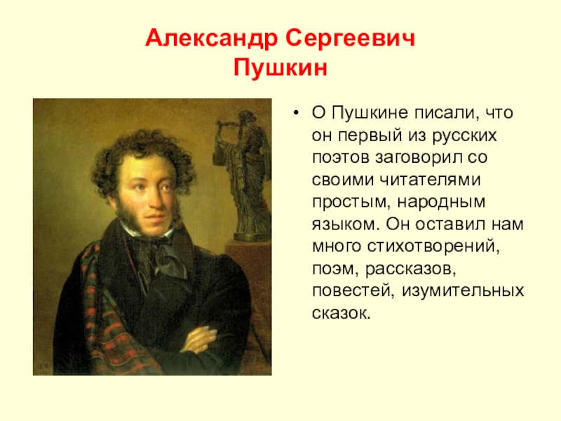 Александр Сергеевич  ПушкинО Пушкине писали, что он первый из русских поэтов заговорил со своими читателями простым,