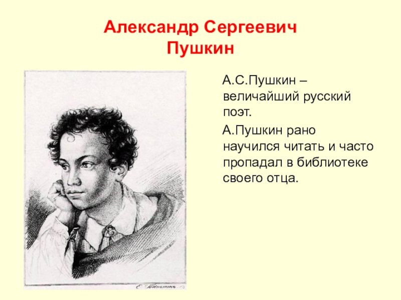Александр Сергеевич  Пушкин  А.С.Пушкин – величайший русский поэт.  А.Пушкин рано научился читать и часто