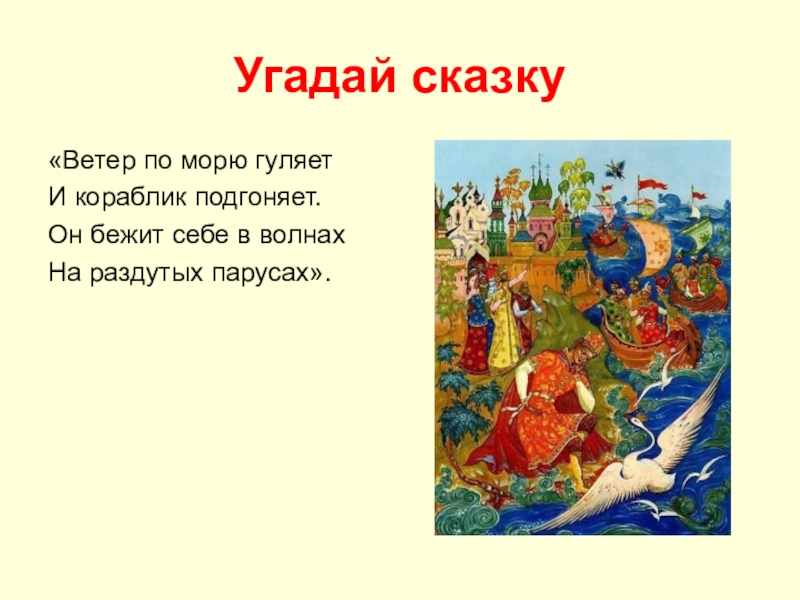 Угадай сказку«Ветер по морю гуляетИ кораблик подгоняет.Он бежит себе в волнахНа раздутых парусах».