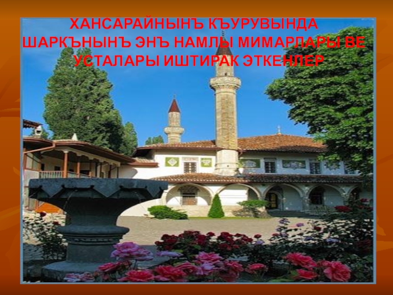 Слайд 9ХАНСАРАЙНЫНЪ КЪУРУВЫНДА ШАРКЪНЫНЪ ЭНЪ НАМЛЫ МИМАРЛАРЫ ВЕ УСТАЛАРЫ ИШТИРАК