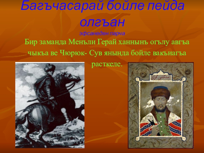 Багъчасарай бойле пейда олгъан эфсанеден парчаБир заманда Менъли Герай ханнынъ огълу авгъачыкъа ве Чюрюк- Сув янында