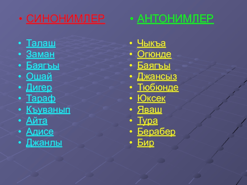 СИНОНИМЛЕРТалашЗаманБаягъыОшайДигерТарафКъуваныпАйтаАдисеДжанлыАНТОНИМЛЕРЧыкъаОгюндеБаягъыДжансызТюбюнде ЮксекЯвашТураБераберБир