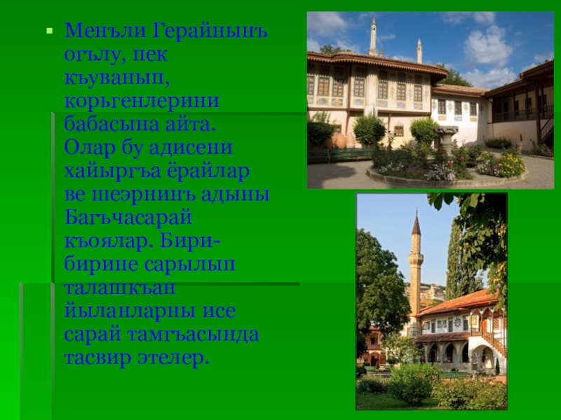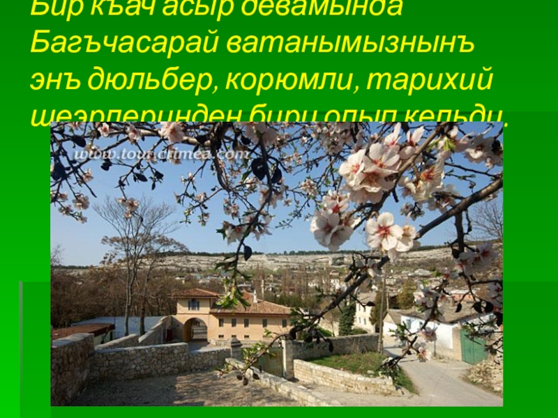 Слайд 6Бир къач асыр девамында Багъчасарай ватанымызнынъ энъ дюльбер, корюмли, тарихий шеэрлеринден