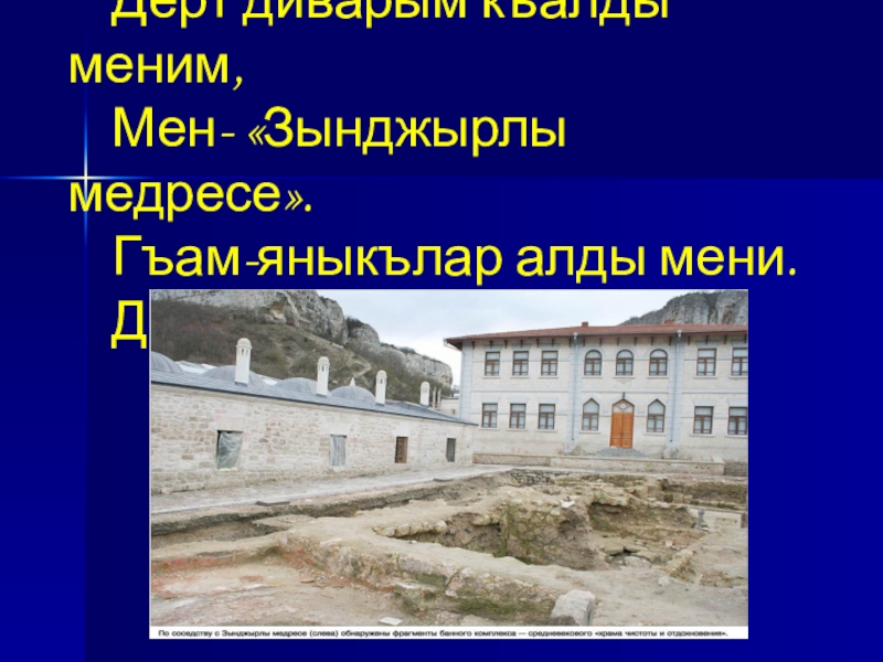 Слайд 16 Дёрт диварым къалды меним, Мен- «Зынджырлы медресе». Гъам-яныкълар алды мени. Дертлерим де эп осе…