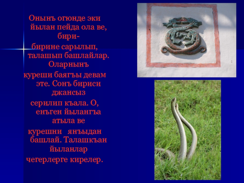 Слайд 18Онынъ огюнде эки йылан пейда ола ве, бири-