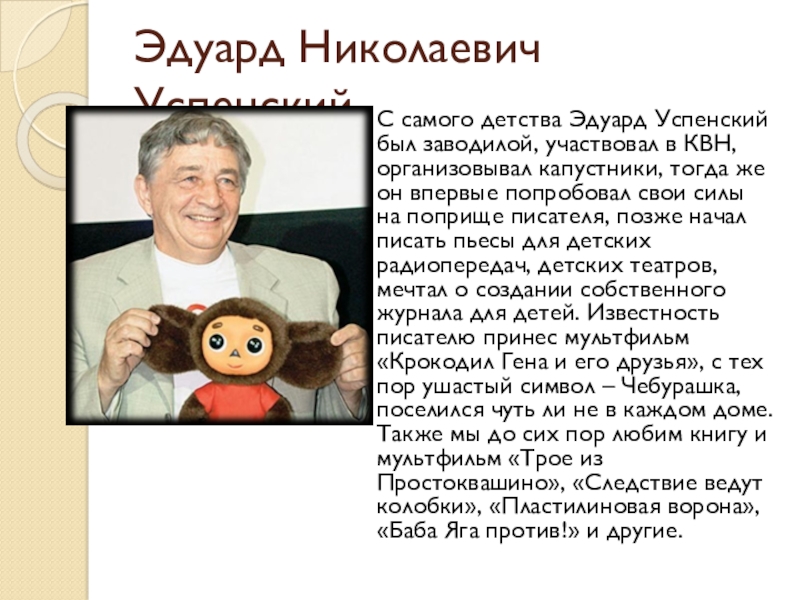 Его можно считать классиком отечественной детской литературы: литератор, председатель Союза писателей РСФСР, талантливый поэт, писатель, баснописец, драматург. Именно он является автором двух гимнов: СССР и Российской Федерации. Он много времени уделял общественной деятельности, хотя сначала мечты стать писателем у него не было: в юношестве он был и разнорабочим, и участником геологоразведочной экспедиции. Все мы помним такие произведения как «Дядя Степа – милиционер», «А что у Вас», «Песенка друзей», «Три поросенка», «Под новый год» и другие.