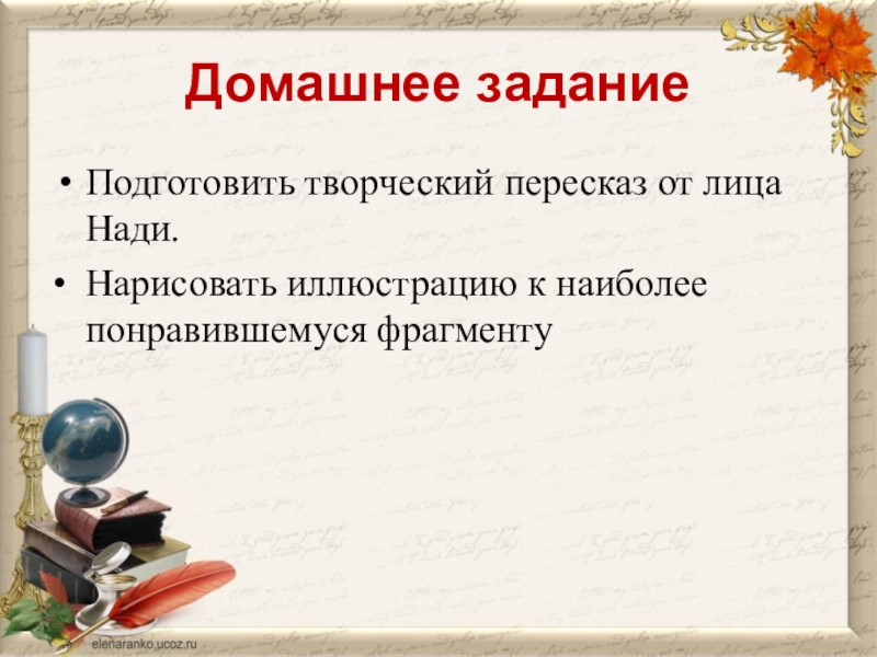 Домашнее заданиеПодготовить творческий пересказ от лица Нади.• Нарисовать иллюстрацию к наиболее понравившемуся фрагменту