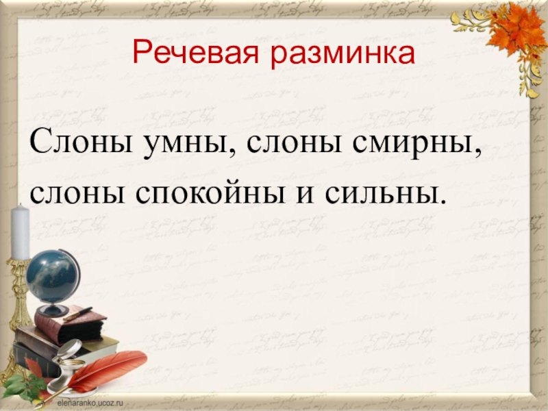 Речевая разминкаСлоны умны, слоны смирны, слоны спокойны и сильны.