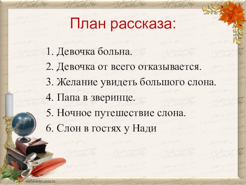 План рассказа:1. Девочка больна.2. Девочка от всего отказывается.3. Желание увидеть большого слона.4. Папа в зверинце.5. Ночное путешествие
